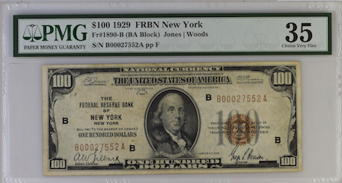 1929 FRBN NEW YORK FR#1890- B ( BA BLOCK) JONES WOODS 35 CHOICE