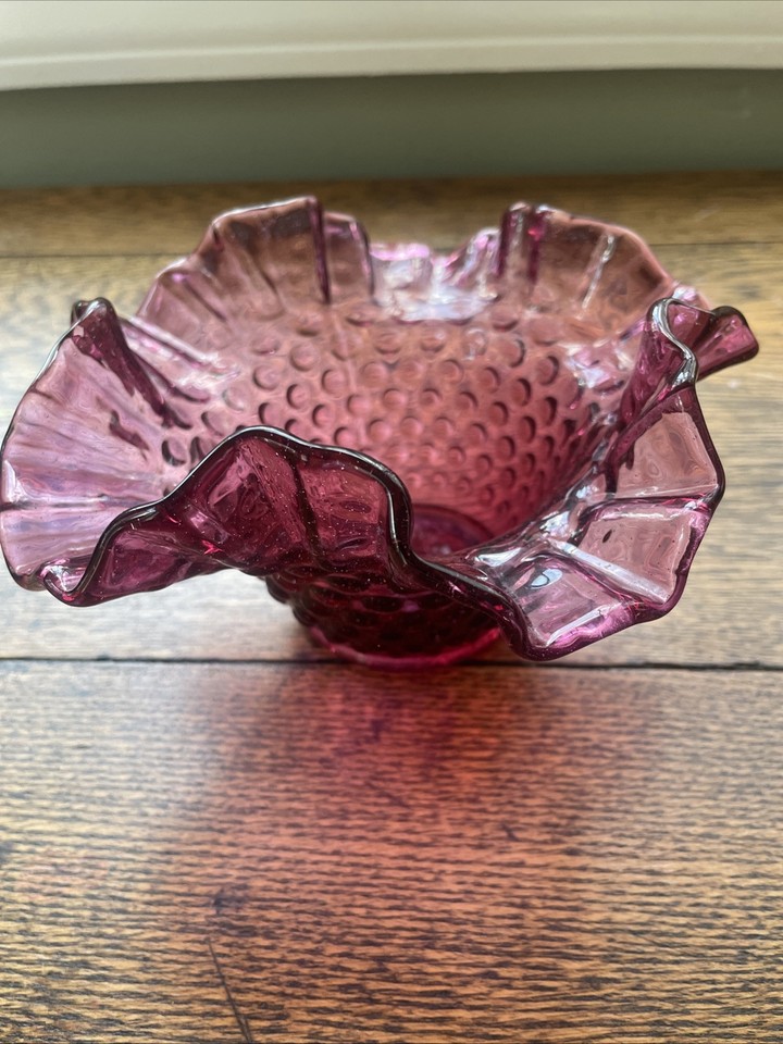 Vintage Hobnail Ruby Pink Cranberry Glass Bowl 6”Ruffled Crimped