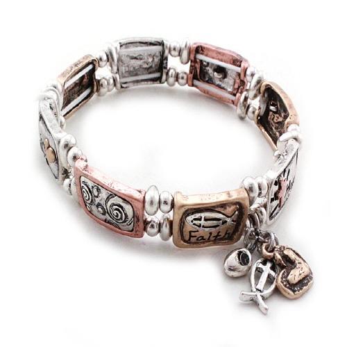 Faith Hope Love Heart Fish Stretch Burnish Tri Tone Inspirational Bracelet