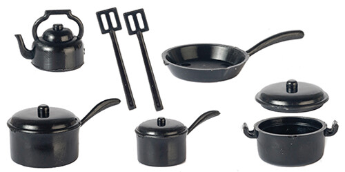 Miniature Dollhouse 10 Piece Black Pots Pans Accessories 1:12 Scale New