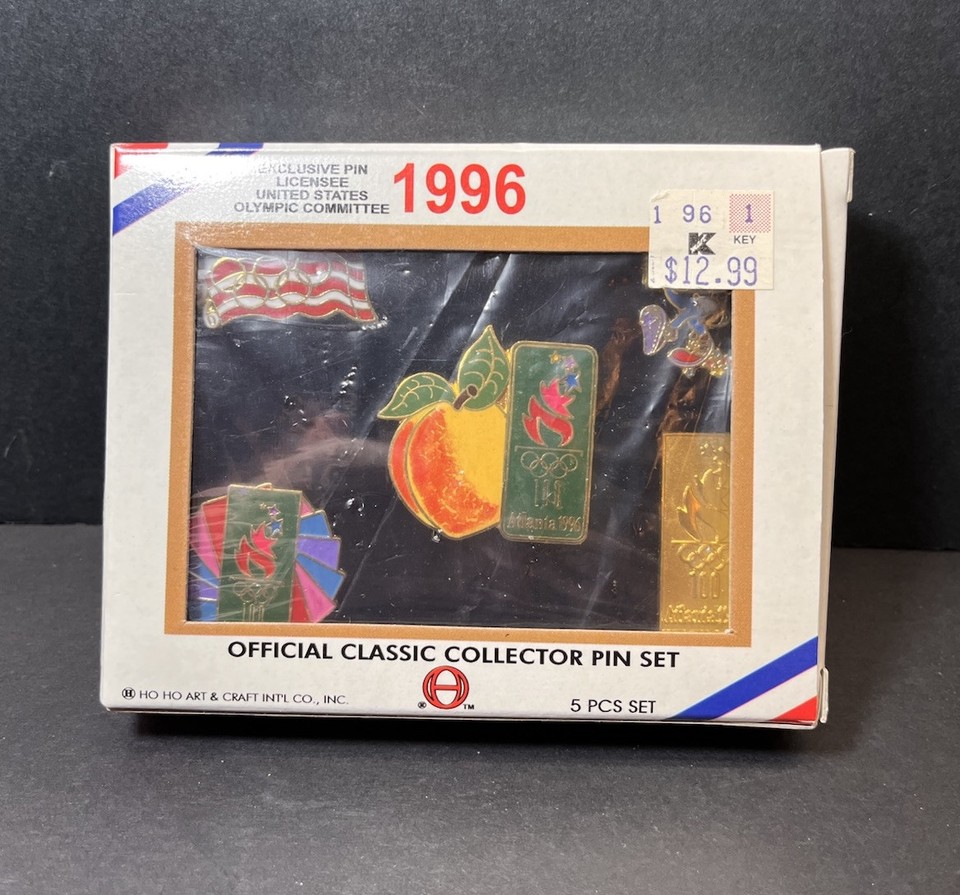 Atlanta 1996 Olympics Boxed 5 Pin Set - Peach, US Flag, Torch, Mascot, Colors