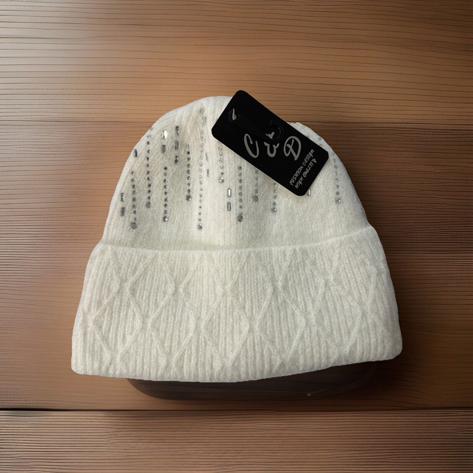 James Paul Womens White Sequin Knit Beanie Hat C & D Design Rhinestones Acrylic