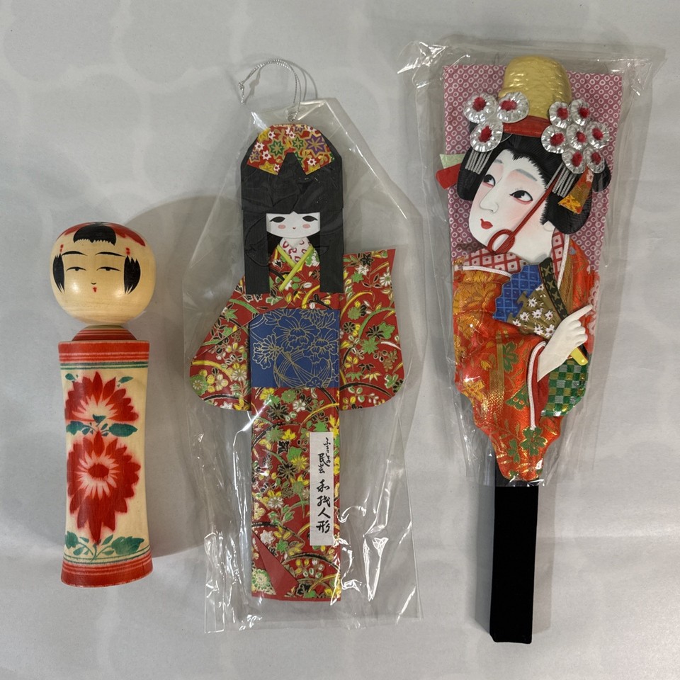 Vintage Japanese Handmade Kokeshi Figure Saranoki Geisha Doll & Fan Lot of 3