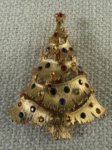 Vintage J.J Jonette Christmas Tree Pin Brooch Multicolor Rhinestone