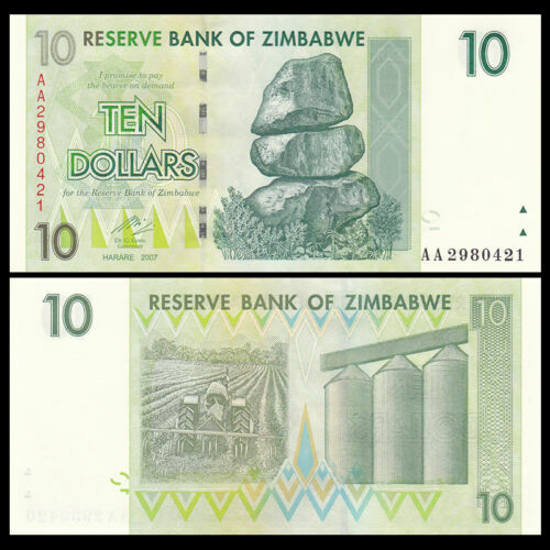 Banknote - 2007 Zimbabwe, 10 Dollars, P67 UNC, Balancing Rock(F) Farmer/Silos(R )