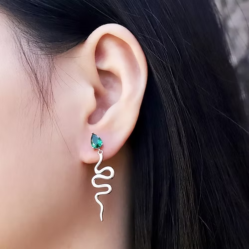 Women 925 Sterling Silver Snake Stud Earrings Green Cubic Zirconia