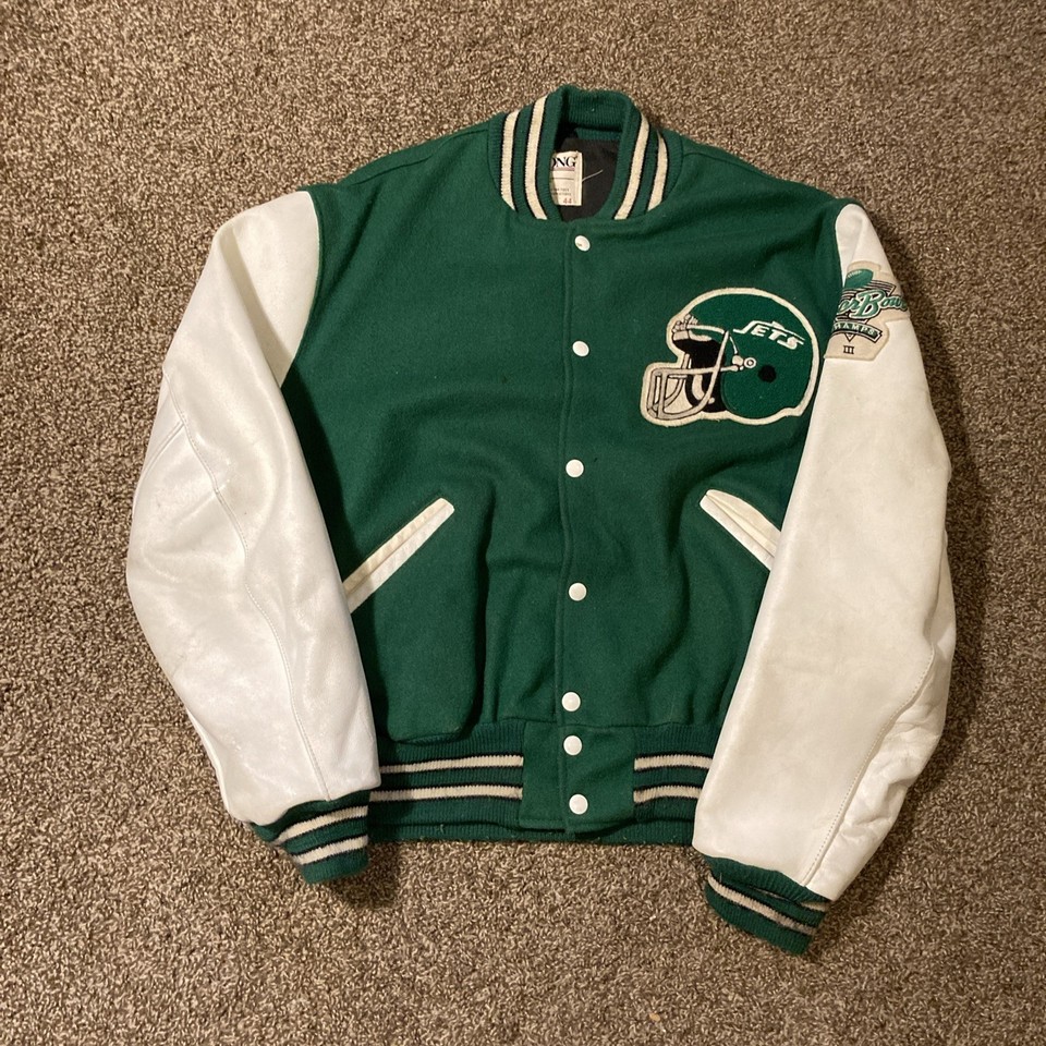 Vintage 80s 90s New York Jets Delong Script Wool Leather Jacket Sz 44 NFL