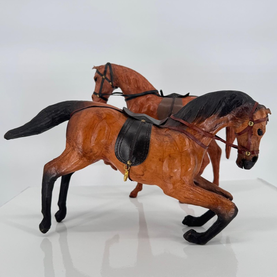 VTG Paper Mache Leather-Wrappe d Brown Saddle 2 Pc Horse Figurine Farmhouse Decor