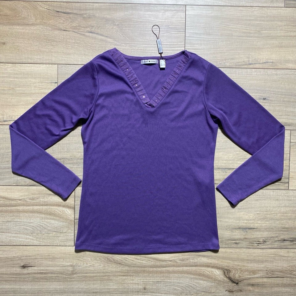 Punt Roma Womens Long Sleeve V-Neck Top Size Small Purple Rhinestone Accents