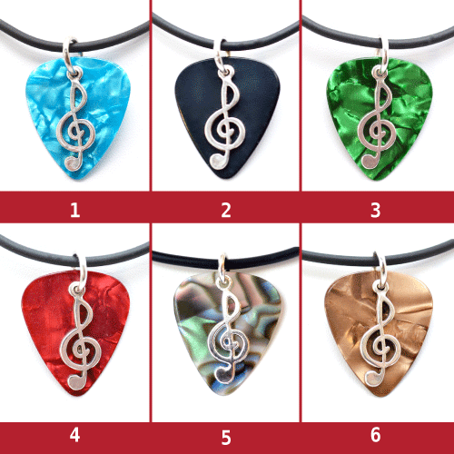 Guitar Pick Necklaces -- with Music Clef Note Charms Various Colors