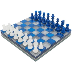 Blue & White Alabaster Chess & Draughts with Inlaid Chest