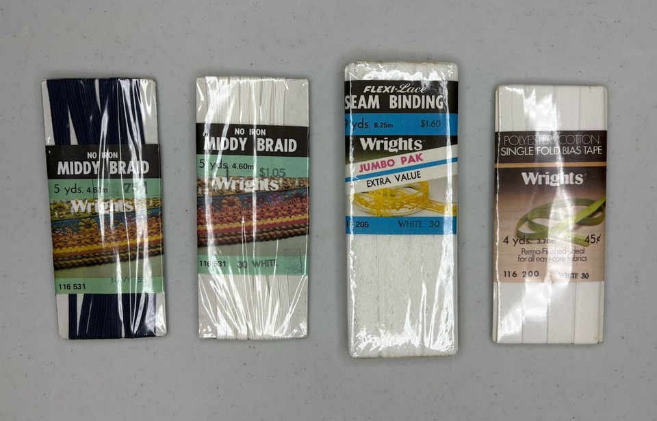 Lot Of 4 Sealed NOS Wrights Brand Bias Tape, Lace Seam Binding, & Middy Braid