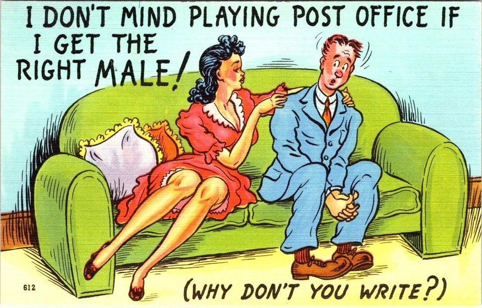 Humor WOMAN~Will Play Post Office~Get The Right Male! ca1940's Linen Postcard