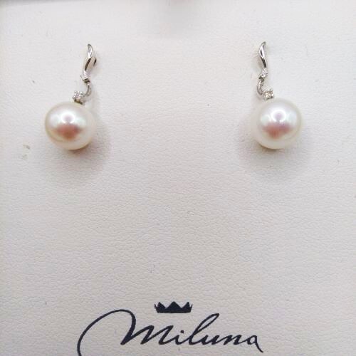ORECCHINI PENDENTI CON PERLE 8MM E DIAMANTI, ORO BIANCO 9KT, NUOVI