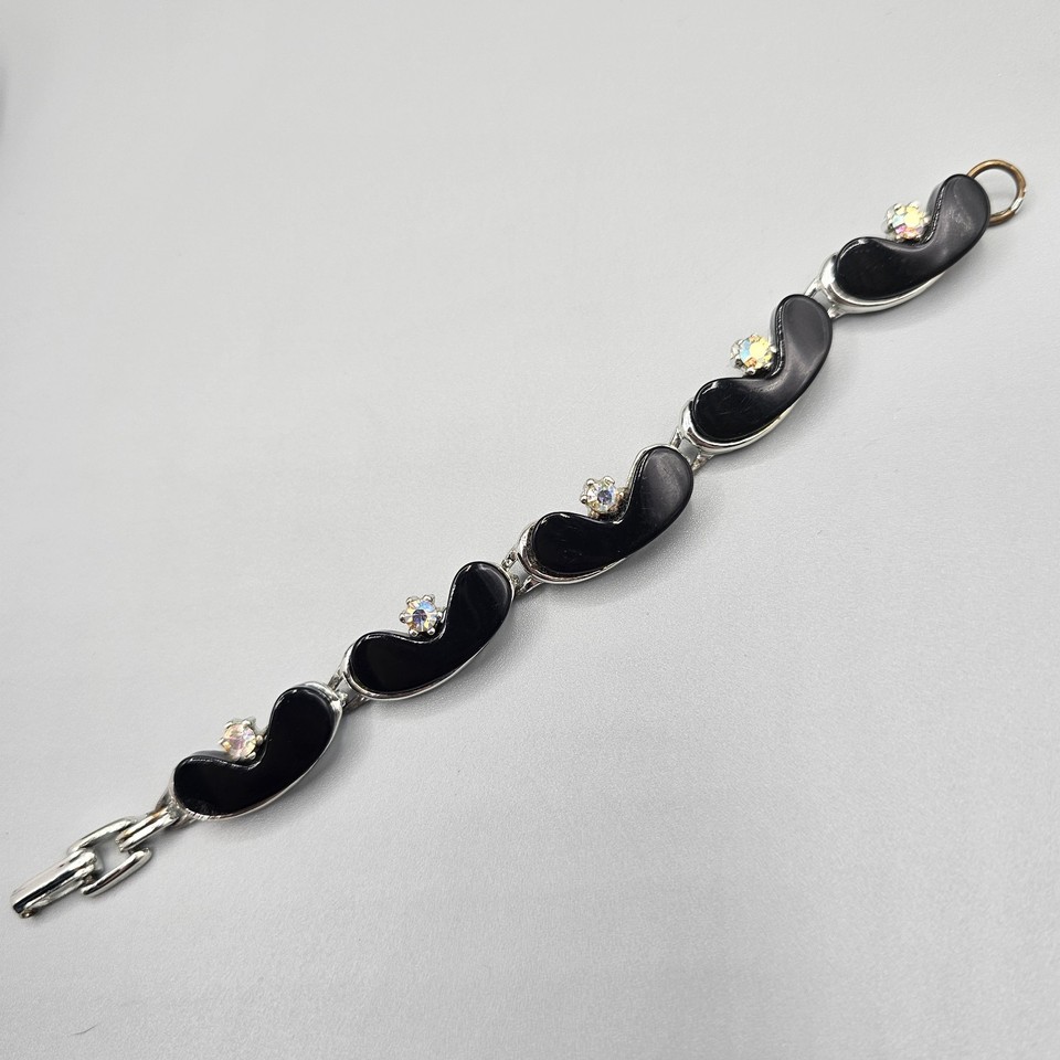 Vtg Black Thermoset Bracelet Kidney Links AUrora Borealis Crystal Accent 6"