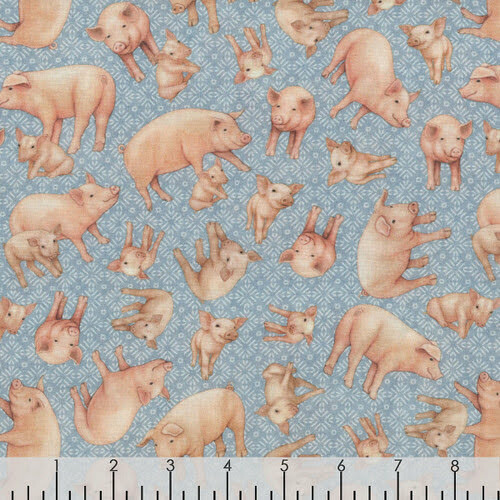Fabric Pigs Farm Greener Pastures on Blue Cotton QT 1/4 Yard 28087B