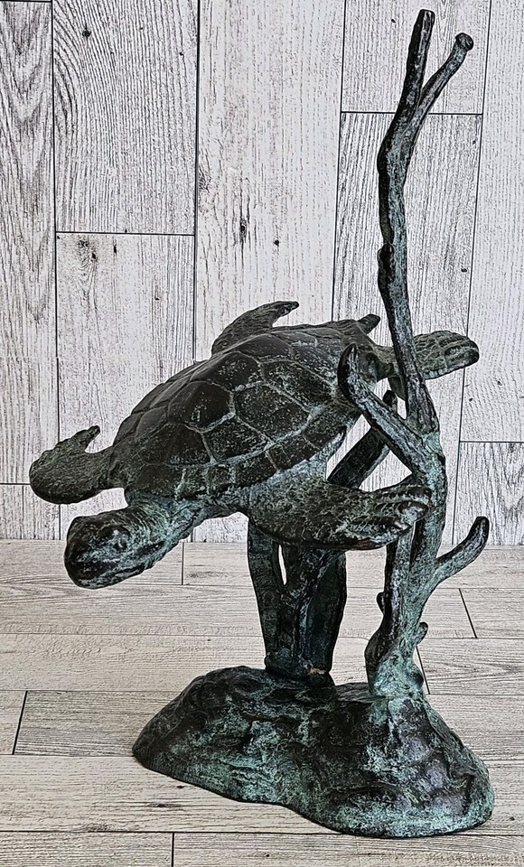 Vtg Sea Turtle Sculpture Figurine Solid Brass Swimming In Coral 9.5" Tall