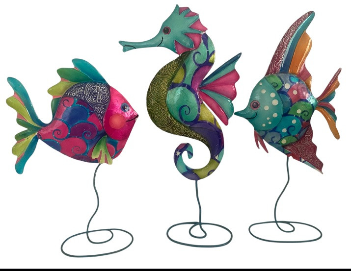 Set of 3 Metal Sea Horse And Fish Beach Theme Decor Art Decorations On Stands
