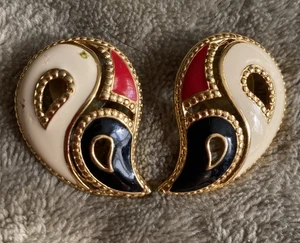 Avon Paisley Enamel Pierced Earrings Black Red Beige Gold Tone Classy