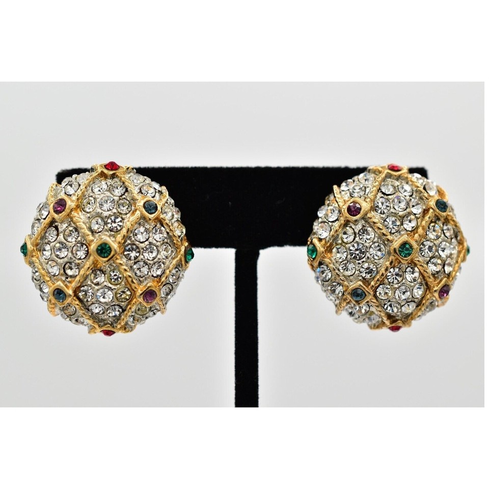 Vintage Crystal Clip On Earrings Rhinestone Gold Large Chunky Heavy 1980s Bin4