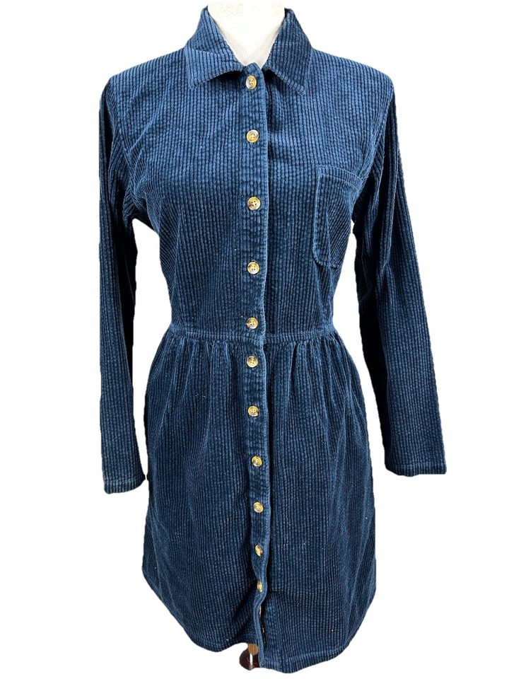 Vintage L.L. Bean Blue Corduroy Button Up Midi Shirt Dress Size 10 Academia
