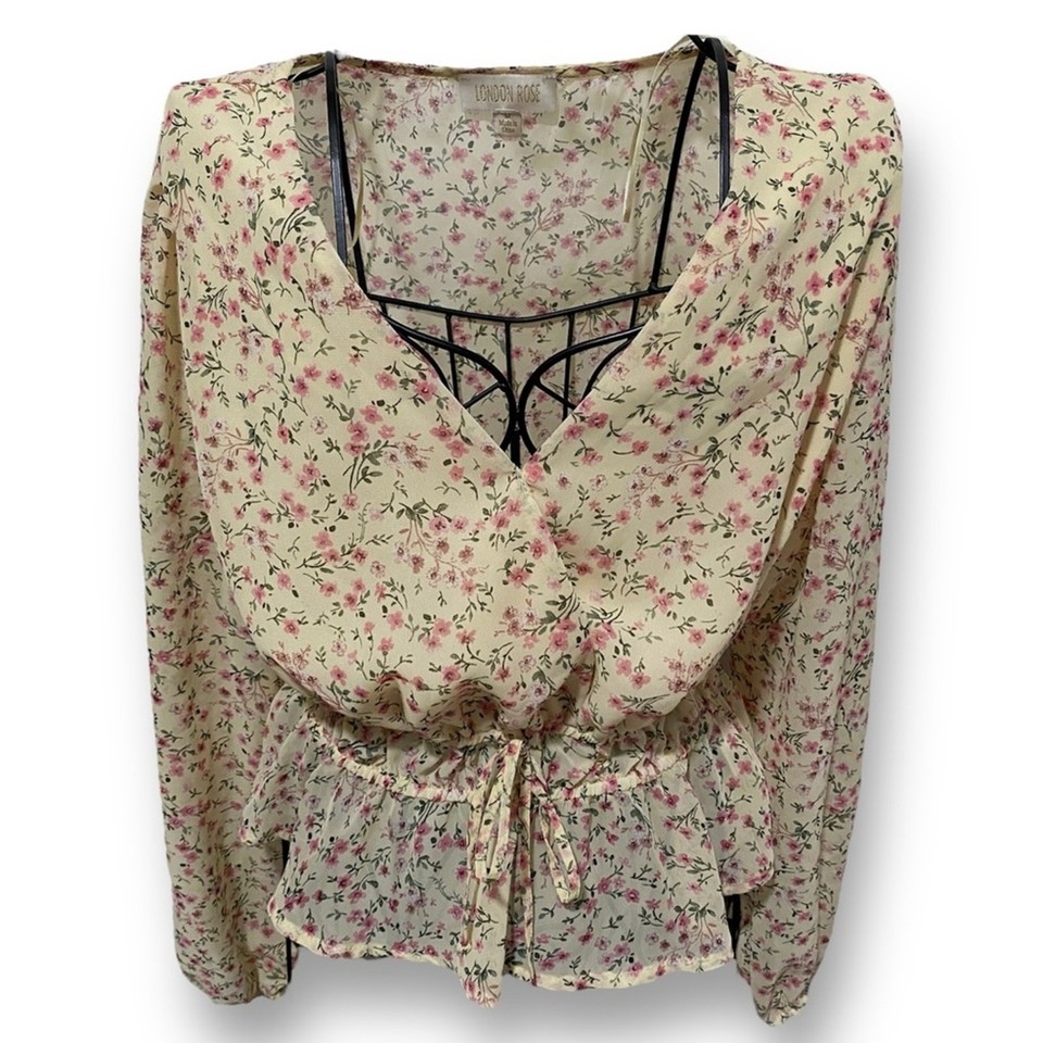 LONDON ROSE Floral Print Blouse Size Medium Surplice Front Elastic Waist Top