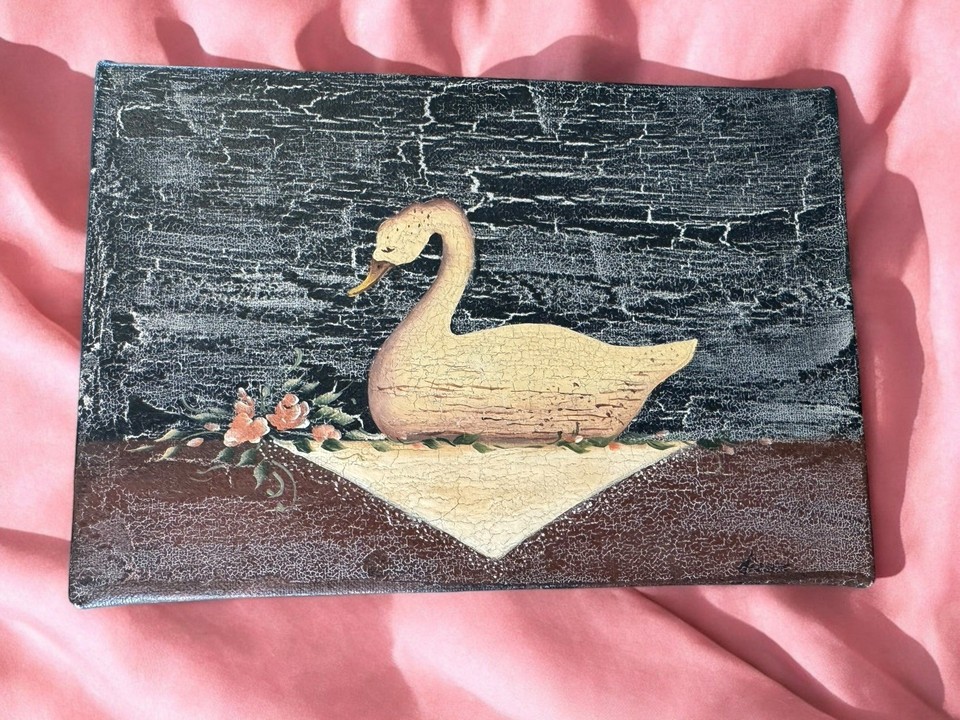 Original Oil Painted Art Wooden Swan Display Table Crackle Finish COTTAGECORE