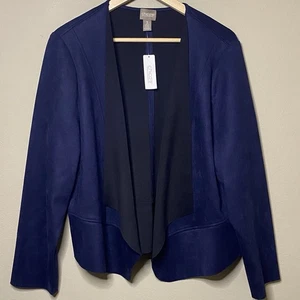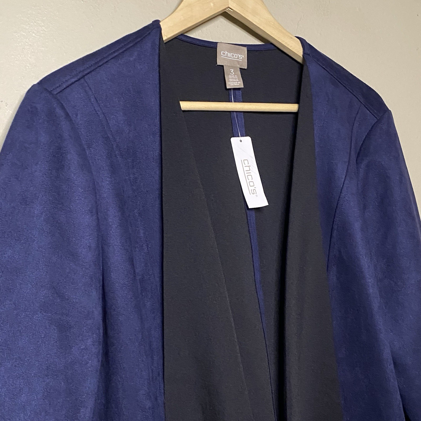 Chico’s Faux Suede Waterfall Drape Open Front Jacket Women XL Midnight Blue New