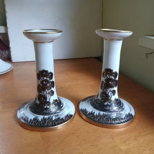 1916 ERA NIPPON MORIMURA BROS MATCHING PAIR PORCELAIN CANDLESTICKS HUT & TREES