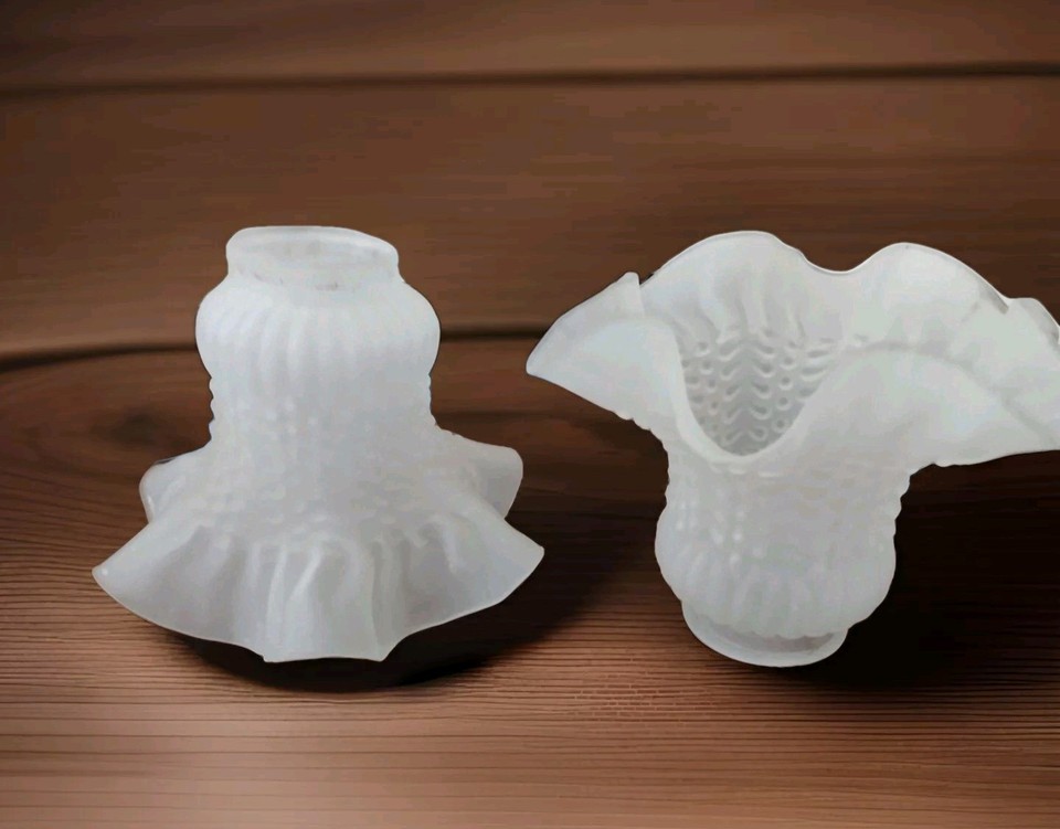 Pair 2 Vintage Glass Ruffle Frosted Hurricane Lampshades Shades Lamp Fitters