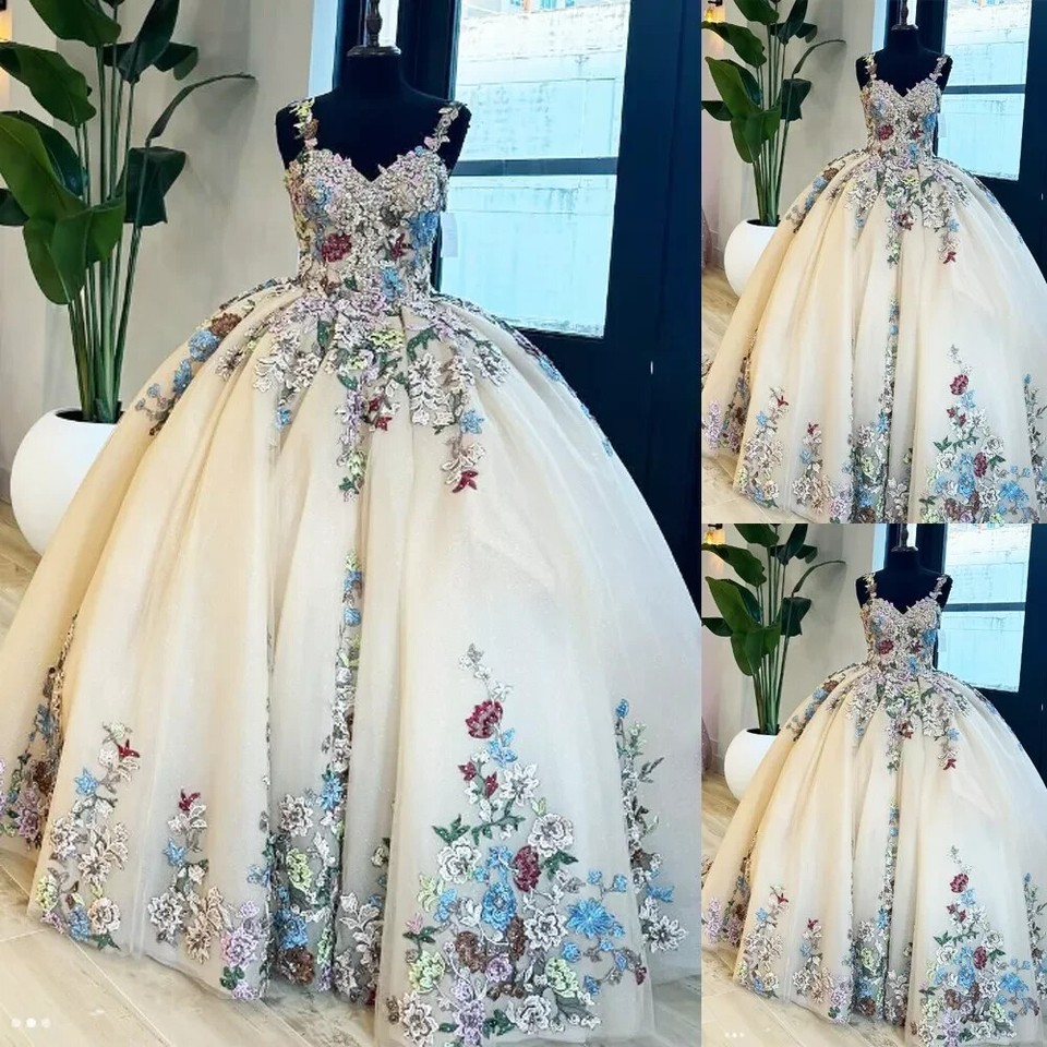 Cubic Floral Quinceanera Dresses Straps Sweet 16 Glitter Princess Prom Ball Gown
