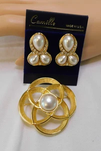 Camille Faux Pearl Brooch and Faux Pearl Crystal Clip on Earrings Set