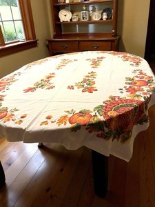 Vintage Thanksgiving Tablecloth 50x64 Turkey & Fall Leaves Print