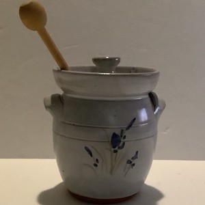 Pottery honey jar pot 1993 Owens pottery salt glazed Wood Honey Dipper Vintage