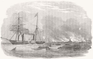 ROMANIA. Destruction of Sulinah, at the mouth of the Danube 1854 old print