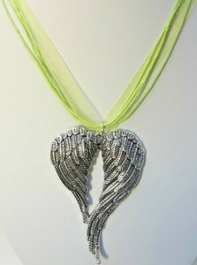 HALSKETTE FLÜGEL HERZ SILBER KETTE ORGANZA ANHÄNGER ENGELSFLÜGEL GRÜN APFELGRÜN