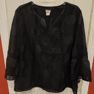 Chico's Blouse Womens Sz 3 Black Split Neck Lace Trim Polka Dot Tunic Top