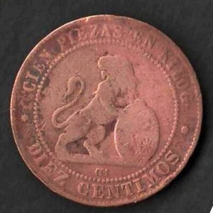 SPAIN 1870 Very Good Copper Smooth Round Coin 10 Centimos KM# 663