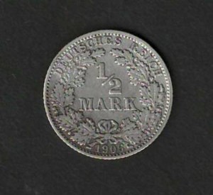 GERMANY 1909 Fine Silver Coin 1/2 Mark KM # 17 dc10