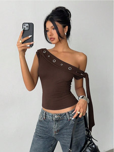 Aloruh Chicken Eye Decor Asymmetric Shoulder Sleeveless Solid Color Knit Top