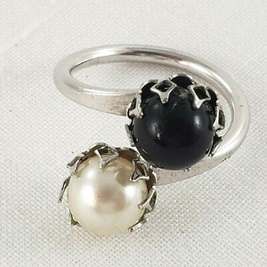 Ring Fashion Adjustable Sz 6 and up Silver Tone Faux Pearl and Black Stone