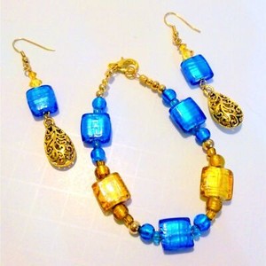 Royal Blue and Gold Dichroic Glass Bead Bracelet and Drop Earring Demi Set