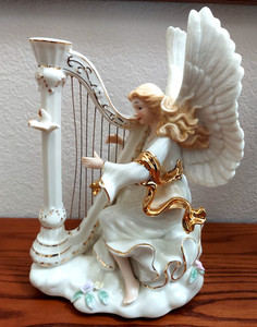 White Angel Figurine Playing Harp With Gold Trim w/ Music Box 11 X 7 inches