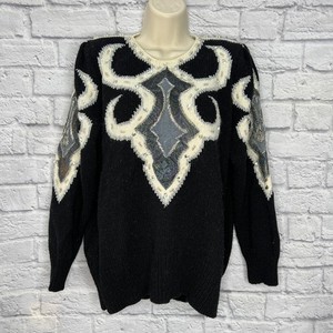 Vintage 80s Beaded Sweater White Black Size L Wool Blend Long Sleeve Holidays