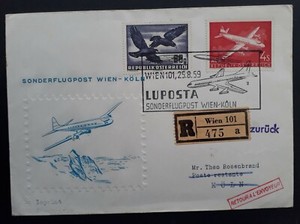 1959 Austria Luposta Special Flight Vienna to Koln Registd Cover ties 2 stamps