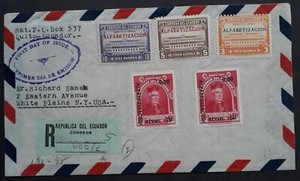 RARE 1950 Ecuador Airmail Registd Literary Campaign FDC ties 5 stamps