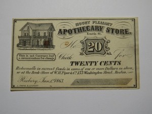 $.20 1863 Roxbury MA Obsolete Currency Bank Note Bill Mt. Pleasant Apothecary