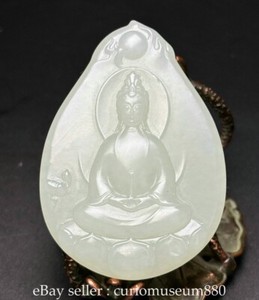 2.4" Old Chinese Natural White Jade Carving Sit Guanyin Kwan-yin Pattern Amulet