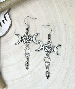 Pair Triple Moon Goddess Earrings Pentagram Star Wicca Pagan Goth Fertility