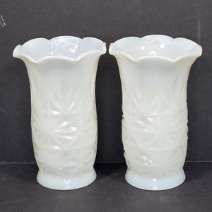 Lot of 2 Vtg Hazel Atlas White Milk Glass Starburst Pattern Vase 5.75" Tall